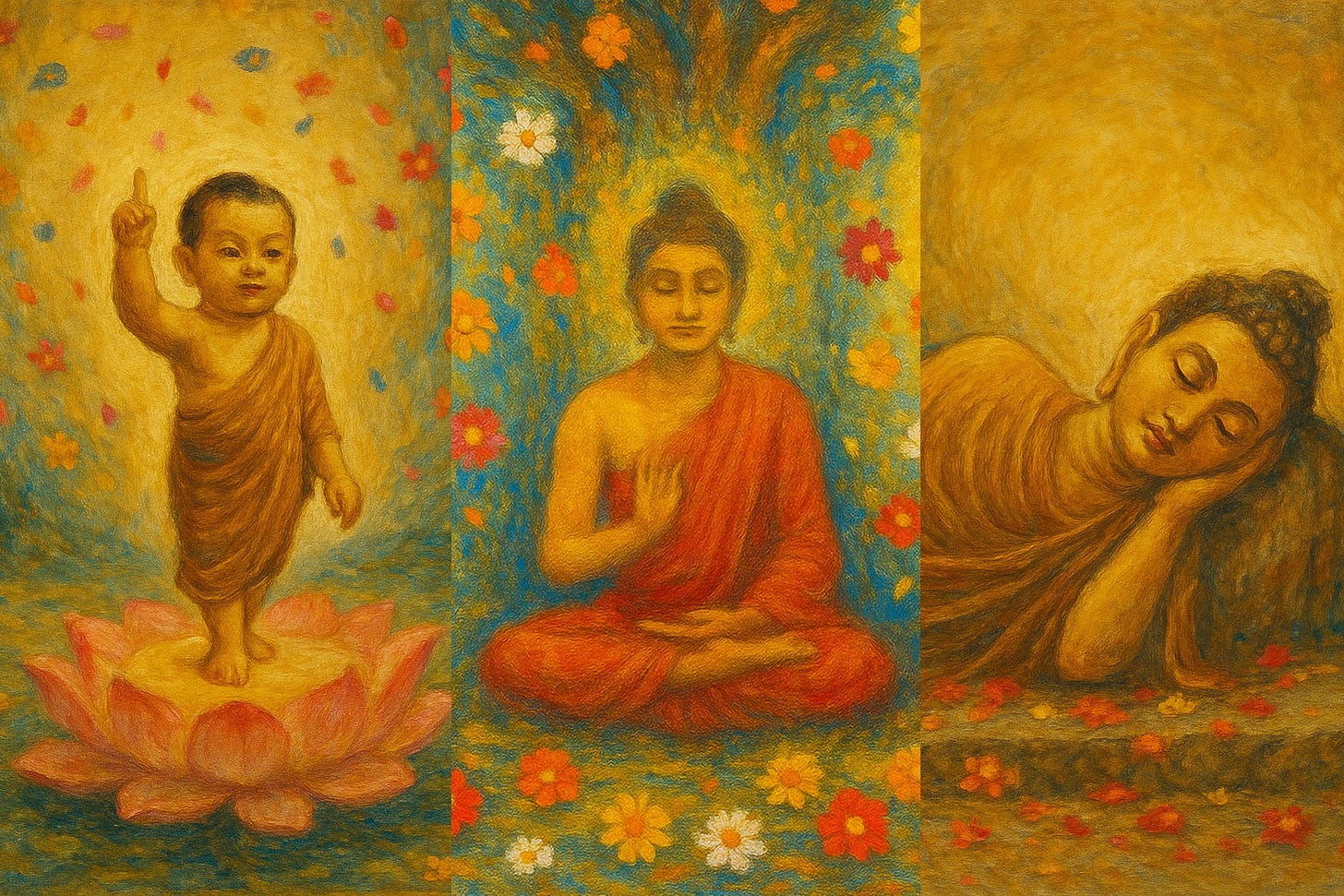 These three events are marked by nature’s unusual harmony, celestial offerings, and profound silence, reflecting the cosmic significance of the Buddha’s presence.
